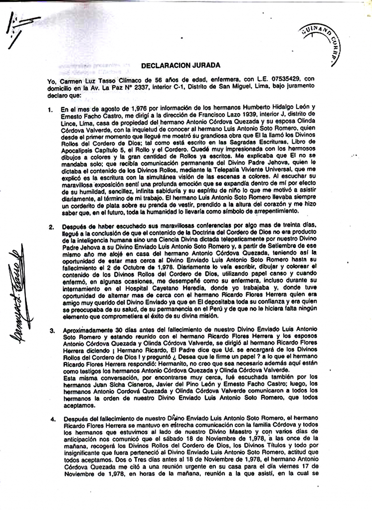 Varios testigos presenciales afirman, con entrevistas, testimonios e incluso con Declaraciones Juradas, que el hermano Ricardo Flores, (†) (al centro con anteojos), fue la persona a quien el Padre Jehová le dejó los rollos
