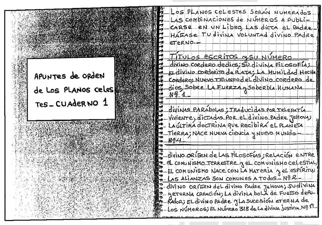 Cuaderno donde el Padre Eterno indica la numeración para editar un libro de 96 Planos Celestes. Fotocopia de este cuaderno, que por años fue ocultado, salió a la luz gracias a una denuncia interpuesta al Instituto Nacional de Defensa de la Competencia y de la Protección de la Propiedad Intelectual (derechos de autor) INDECOPI