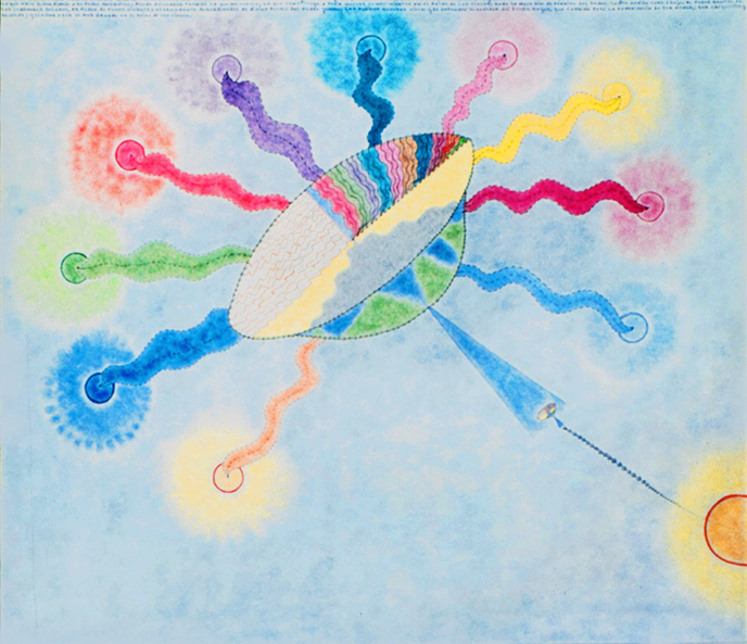 Este dibujo celeste enseña cómo entran los fluidos solares en la construcción de un platillo volador; los fluidos solares son fuerzas magnéticas, que en su propio calor, llevan las ondas vibratorias de las que nace la materia; en los fluidos solares están todos los movimientos que tienen los planetas; entre otros la rotación y la traslación; lo de arriba es igual a lo de abajo; el principio de todos los movimientos que tiene un planeta, se inicia en el mismo instante en que éste surge como una microscópica chispita de los soles; todo movimiento es en su nacimiento principio de fuego; nace como temperatura; que se va solidificando junto con la materia del planeta; cuando se construye un platillo volador ocurre lo mismo; lo de arriba es igual a lo de abajo; las líneas magnéticas, representadas por líneas negras punteadas, penetran en medio de una caloría colosal, en un puntito hecho vacío; este puntito es un acuerdo entre infinitos soles que participan en la construcción del platillo; es una divina alianza donde deben encontrarse los fluidos mentales; el puntito hecho vacío también lo es; es una divina alianza entre los querubines de la nada y los querubines de las materializaciones; si ellos no están de acuerdo, no se construye nada; se escoge otro puntito de vacío en el inmenso espacio; poseen, como el infinito mismo, jerarquías; la construcción de éstas naves asemejan enormes bolas de fuego que se asimilan a todos los soles; existiendo entre la nave y los soles, un comunismo amoroso; la nave está en los soles y los soles en la nave; el todo sobre el todo; la trinidad solar, está materializada en una nave celeste que será eterna y preexistente a los mismos mundos materiales; porque fue construida por divinas criaturas cuyo magnetismo es tan inmenso, como inmenso es un sol; como inmenso es la forma viviente que poseen; las dimensiones de estas naves son sencillamente aterradoras para las proporciones humanas; causarían tal pavor, si el mundo las viera, que éste se paralizaría; en su naturaleza y en sus criaturas; porque los tres son de fuego; los platillos, el planeta y las criaturas; todos tienen un mismo origen; materia y espíritu son salidos de una misma causa y manifestados en diferentes libres albedríos; toda forma geométrica posee libre albedrío viviente; y las naturalezas de los planetas, son criaturas geométricas; cuyos elementos fueron creados con las mismas leyes, con que se construyen los platillos voladores; lo de arriba es igual a lo de abajo; es por eso que estas naves perturban las atmósferas de los planetas; es la jerarquía magnética la que se revela; los vehículos terrestres sienten la presencia de algo superior; sus moléculas, dentro de sus leyes mismas, se sienten impotentes ante otra atracción que es familiar; magnetismo viviente hecho ley física, reconoce a magnetismo viviente, venido de lejanas galaxias; es esta la única causa por la que se apagan los focos de luz y se detienen los motores de los vehículos terrestres; y cuando las naves plateadas se alejan, vuelven a funcionar; sus moléculas vuelven a su propia realidad; vuelven a su presente; vuelven a cumplir las leyes de su presente reencarnación; a su presente nacimiento; porque nacer de nuevo y reencarnar, son una misma cosa; una ley puede expresarse de muchas formas; y no deja de ser la misma ley; así como vosotros tenéis millones y millones de individualidades, y sois siempre los mismos humanos; interpretáis en infinitas formas, y según vuestro pensar y evolución, al mundo o universo que os rodea; y no deja de ser un mismo mundo y un mismo universo; la construcción de los platillos voladores cumple la misma ley; porque así como vosotros les llamáis objetos voladores no identificados, así también, en lejanos mundos les tienen sus nombres; y según las ciencias y las evoluciones, son conocidas o desconocidas; cuando los mundos son mundos infantes, sus tamaños son pequeños; y cuando recién nace la chispita inicial del futuro planeta, es un mundo bebé; porque hay que ser primero chiquitito y humilde, para llegar a ser grande en el reino de los cielos; llegar a ser un colosal planeta; tal como una criatura, que siendo o principiando como bebé, aspira a llegar a ser también grande; llegar a ser adulto; porque la misma ley de crecimiento y desarrollo, es igual tanto para el espíritu como para la materia; los platillos voladores nacen también bebés; pues los fluidos solares poseen también infancia; y la infancia tiene sus derechos; más aún; la infancia es la primera en el reino de los cielos; porque es la más pura en su pensar; las leyes solares son igualitarias en eterna expansión relativa; tal como lo son las individualidades humanas; nunca se igualan en sus pensares mientras vivan la relatividad espiritual y material; todo tiene su tiempo; principio y fin son eternos y relativos; la construcción de los platillos voladores igual; mas, por sus jerarquías poseen eternidad dentro de la eternidad; son creadores de eternidades; y toda eternidad está subordinada al Padre; en el cálculo matemático que entra en la creación de un platillo volador, es ley mental; allí no se necesita de símbolos; aunque pueden tenerlos; por lo general las jerarquías poco elevadas, hacen uso de ellas; las matemáticas mentales son ciencias de fuego solar; con ellas el divino Padre crea los universos; la transmisión y divinas órdenes es por telepatía universal; la misma telepatía del Padre, es simultánea a la creación; que es expansiva y subordinada al pensar del Padre; se enseñó al mundo, que el Creador es infinito; recién ahora empezará el mundo a comprender ese infinito en el Padre; cuando vaya comprendiendo por intelectualidad, cómo se hicieron las cosas; qué es lo que sucedió y aún sucede; qué es lo que ocurre en la lejanía del universo; escenas jamás dadas a conocer; de donde yo soy, ustedes no pueden ir; he aquí las divinas palabras de mi hijo p