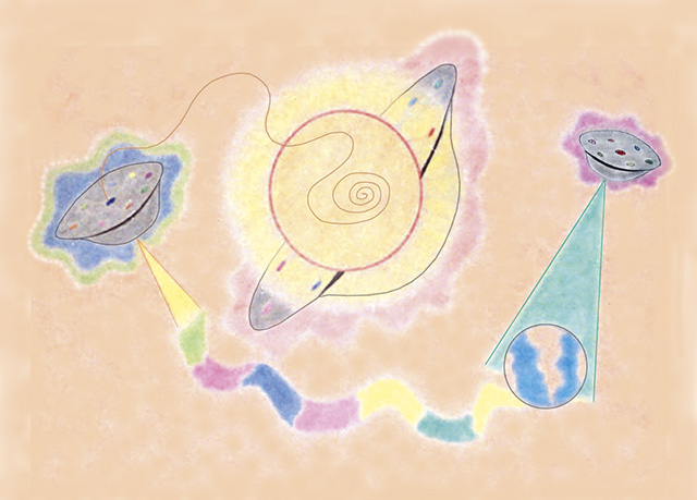 Sí hijito; este dibujo celeste enseña que los platillos voladores atraviesan infinitos cielos; cada cielo es una dimensión hecha presente; y a medida que se avanza por el cosmos, salen al encuentro infinito cielos de colores; a medida que se avanza atravesando soles, van apareciendo mundos de todas las formas imaginadas; soles de tamaños que causan pavor; tal como tú los ves a diario; Así es divino Padre Jehova, por tu gracia divina, veo seres gigantescos; veo a la divina madre solar Omega; veo que toda virtud conocida es un gigantesco sol; veo enormes platillos voladores; veo que más allá de este microscópico planeta Tierra, todo existe; Así es hijito; es por ello que se os enseñó, que el Padre Jehova es infinito en su creación; Y veo divino Padre, brillantes cordones solares; con que están unidos soles y platillos; ¿Son los mismos cordones, con que veo a mis hermanos terrenales? Así es hijito; lo de arriba es igual a lo de abajo; hasta los microbios tienen sus cordones solares; Así lo veo divino Padre Jehova; he visto también el cordón solar de la Tierra; veo a la Tierra con una inclinación notoria en su eje solar; ¿Por qué divino Padre Jehova? Admirable observación has hecho hijito; te lo explicaré: La Tierra a partir del mismo instante en que Adán y Eva violaron la divina ley de la obediencia al Padre, el eje polar de la Tierra, dejó de ser paralelo a sus moléculas; porque lo que sale del espíritu, repercute en la materia; esta desviación es imperceptible; con el correr de los siglos, y gradualmente, el eje polar de la Tierra ha llegado a 42º de desviación; esta desviación trajo consigo las estaciones; porque en el paraíso microscópico de Adán y Eva, había solo una estación; y era la eterna primavera; tal como la ves hijito; Así es divino Padre Jehova; veo el paraíso microscópico; veo que todas sus criaturas son telepáticas; y veo que hasta los elementos conversan con los seres pensantes; veo que el paraíso era del porte de una pelotita de ping-ping; Así es hijito; y eso está escrito en las escrituras del Padre Jehova; ya recuerdo divino Padre Jehova; dice tu divina palabra: Hay que ser chiquitito y humilde, para llegar a ser grande en el reino de los cielos; Así es hijito; y quien no ha sido chiquitito y humilde, no entra al reino del Padre; ¿Cómo se llega a grande divino Padre? También está en mis escrituras; haz memoria; ya recuerdo divino Padre Jehova; dice tu divina palabra: Todo espíritu nace de nuevo; Así es hijito; nacer de nuevo es reencarnar de nuevo; una ley se puede expresar de muchas maneras; y no deja de ser la misma ley; a medida que las criaturas del Padre conocen más y más existencias, más grande es el conocimiento que tiene el espíritu; y también el físico; porque de verdad os digo, que todos fuisteis microbios; no solo vosotros; sino, que todo el universo; no hay naturaleza que no haya sido microbio; porque las leyes del Padre, no tienen ni principio ni fin; no tienen límite ni en el tiempo ni en el espacio; no son solo para un mundo; sino, para infinitos mundos; de verdad os digo, que esta revelación avergonzará a los espíritus mezquinos; mezquinos para con el Padre; porque le quitan poder para el resto del universo; estos espíritus atrasados e ignorantes, subordinan el poder del Padre, a sus cálculos microscópicos; de verdad os digo, que quien negó poder al Padre en la Tierra, se le negará a los tales, en el reino de los cielos; todos fuisteis probados en la vida; y nadie pidió al Padre, rebajarlo o quitarle poder; ni en lo más microscópico que podáis imaginar; el reino de los cielos es una dimensión que no tiene fin; jamás lo ha tenido ni lo tendrá; el reino de los cielos, es a la vez infinitos cielos; de verdad os digo, que las lejanas galaxias, están formadas por familias galácticas; tal como lo estáis vosotros; toda organización del microcosmo, se repite en el macrocosmo; lo de arriba es igual a lo de abajo; así como vosotros tenéis una rutina, en otros mundos ocurre igual; de verdad os digo, que millones de mundos os observan; y os miran con una acostumbrada indiferencia; están acostumbrados a hacerlo; lo que para vosotros sería un milagro, para infinitas criaturas del universo, es una cosa normal y rutinaria; porque ellos han nacido mayor número de veces; saben más de las esencias de infinitas clases de materia, de que están constituidos infinitos mundos; y a la vez, otros observan a ellos; y a éstos, otros; la observancia es una sucesión eterna; no tiene ni principio ni fin; solo el Padre sabe, lo que el universo no sabe; y piden nacer de nuevo, para saber lo que el Padre sabe; más el Padre es inalcanzable en su divina sabiduría; de verdad os digo, que la presencia del universo material, es por causa salida de hijos, que buscan la sabiduría del Padre; los mundos, los soles, las galaxias, los universos, y todo cuanto existe, existió y existirá, es sabiduría por la que pasó el Padre; he aquí la máxima expresión del mérito espiritual; la máxima expresión, es también creación en el Padre; porque todo lo conocido salió de Él; y porque habiendo pasado por todo, está en todas partes; de verdad os digo, que de todo lo que creó el Padre, sus divinos mandatos es lo primero por sobre todas las cosas; porque la palabra viviente hecha escritura o doctrina, lleva su divina cualidad y calidad, salida de su libre albedrío; es lo más cercano a lo que pensó el Padre, con respecto a determinado mundo; de verdad os digo, que vuestro sistema de vida llamado capitalismo, es hipócrita ante el Padre; porque explota al mundo y ruega a la vez al Padre; mata e implora la protección del Padre; viola muchas leyes, y habla de Dios; de verdad os digo, que ningún capitalista hipócrita, entrará al reino de los cielos; ni ninguno entrará; ni seguidores de este extraño sistema de vida; la vida que pedisteis, es vida que posee vida; y toda vida se queja de un mal espíritu delan