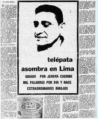 Վերջնական դատաստանը կլինի ազգ առ ազգ, մարդ առ մարդ, մոլեկուլ առ մոլեկուլ, աչք առ աչք, ատամ ընդ ատամ, և այն ավելի մոտ է, քան մենք պատկերացնում ենք, ասում է Լուիս Սոտո Ռոմերոն՝ չիլիացի, ով իր գրվածքներով իրարանցում է առաջացնում Լիմայում: , որոնք, ըստ նրա, ներշնչված են հեռապատիկ կերպով Եհովա Աստծու կողմից։ Այս տարօրինակ կերպարը գրում է կարագի տիպի թղթի հսկայական թերթերի վրա, որոնք նա անվանում է գլանափաթեթներ։ Մոտ 1000 ձեռագիր բառ տեղավորվում է մեկ էջում։ Նա չի օգտագործում քանոն, և այնուամենայնիվ, գրությունը գնում է ուղիղ: Գրելուց բացի, թղթերի մեծ մասի վրա նա անում է գեղեցիկ և հազվագյուտ գունավոր գծանկարներ՝ ոգեշնչված և ի տարբերություն որևէ այլ նկարչի: Նկարներում դուք կարող եք տեսնել թռչող սկավառակներ, մոլորակներ, գալակտիկաներ, աշխարհի քարտեզներ՝ տարօրինակ գծերով, գաղափարների ձևավորում և շատ այլ ձևեր, որոնց հեղինակը պատասխանատու է մանրամասն բացատրելու համար: