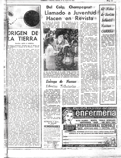 Yo sé que tú me vas a ayudar a difundir esto, esto va a ser tu trabajo en estos momentos —me decía—. (Juan Zegarra, además de entrevistarlo dos veces, ayudó a que se publicaran varios Artículos Divinos). Artículo N° 1, EL ORIGEN DE LA TIERRA, publicado como columna en el diario Correo de Tacna el sábado 22 de junio de 1974 (Crédito: Josué Ll,)