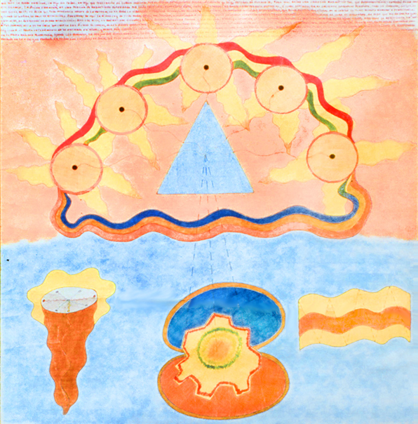 Sí hijito; así es; tal como lo leo en tu divina mente; este dibujo celeste explica lo que es la Santísima Trinidad, en la evolución humana; el conjunto de soles del infinito, representa el conocimiento en Santísima Trinidad expansiva; el Padre es el 1; el hijo siendo el 2, es también el 1; el Espíritu Santo, es el mismo conocimiento de cada espíritu; es lo que se ha ganado con el sudor de su frente; es el sacrificio individual de cada criatura pensante; la Santísima Trinidad posee su número galáctico en toda la creación; pues no existe creación alguna, que no haya salido del 1; no hay creación que no tenga números; todo es creado, en base a matemáticas divinas; todo plan divino, sin excepción alguna, posee cálculo; la Santísima Trinidad, constituye el único destino viviente; del cual han salido todos los mundos, del universo expansivo pensante; todo mundo del infinito espacio, es naturaleza; es universo materializado con microscópicas criaturas vivientes; y estas microscópicas criaturas, poseen a la vez, su propia microscópica Santísima Trinidad; para la naturaleza Tierra, el número de su Santísima Trinidad, es el 318; ella corresponde, a todo el historial humano, frente a toda revelación; en el dibujo celeste, se explican muchas cosas; el divino triángulo celeste, significa que todo padre solar posee tiempo celeste; y que este tiempo es irreversible; es inmutable; es eterno; cada segundo celeste, significa que en la Tierra ha transcurrido un siglo la razón de ello, está en la expansión magnética, emanada de los soles; esta expansión, sigue su propia evolución; sigue su propio impulso inicial que se llevó a efecto en los soles Alfa y Omega; cuando la Tierra era una microscópica chispita eléctrica; los colores que rodean a los soles, son fluidos pensantes; el fluido, está en la misma individualidad de toda criatura; pues es divino producto de ellos; he aquí, el origen de cada determinación humana; cada pensamiento humano, posee color; cada color emanado de la mente, es un futuro mundo de color; que naciendo en forma de idea invisible, se materializa en colosales mundos; allá en las lejanas galaxias; desde el momento que nace una criatura, empieza a salir de ella, una infinita estela o nebulosa de ideas; las primeras ideas que corresponden al estado infante de toda criatura, son de color blanco; este color simboliza la inocencia filosófica de la criatura; pues nada sabe aún, de lo bueno o lo malo; vive la vida contemplativa; la misma vida de los ángeles, en el reino de los cielos; poder mantener esta pureza, durante toda su vida, es la suprema prueba de todo espíritu; sin esta pureza, es imposible que entre el espíritu, en el reino de los cielos; pues toda filosofía aprendida en la pasajera vida humana, es enjuiciada; es por eso, que ningún rico entra en el reino de los cielos; pues esa filosofía, corrompería la pureza espiritual de los ángeles; ellos desconocen tal filosofía; ellos viven el comunismo universal; pues mi filosofía amorosa, es común a todos; ellos viven el comunismo amoroso; con filosofía de niños; es por eso, que fue escrito: Dejad que los niños vengan a mí, porque de ellos es el reino de los cielos; de ellos es la filosofía, que reina en la eternidad; ninguna otra filosofía entra en el reino de los cielos; escrito fue: La Tierra pasará; mas, mis palabras no pasarán; significa que toda filosofía terrestre, que no haya tomado en cuenta al Cordero de Dios, perecerá; pasará al olvido; como ya han pasado tantas; en el divino dibujo, se ven unas líneas negras y punteadas; ellas simbolizan el magnetismo de la vida; ella es el Alfa y la Omega de todo lo que piensa, y respira; este magnetismo está en todo el universo; es expansivo junto con toda creación; en el dibujo se ve que las líneas magnéticas inciden sobre una zona amarilla; esta zona amarilla representa una divina virtud del conocimiento; está infinitamente aumentada; en un número tal, que escapa al cálculo humano; puedo adelantarte hijito, que toda virtud aumentada, es como un rubí; siendo microscópica, brilla en el reino de los cielos; en una magnitud tal, que eclipsa a los colosales soles; su belleza paraliza el corazón humano; esta divina virtud, posee todos los colores, que poseen los soles Alfa y Omega; y son fluidos vivientes; que poseen su propia Santísima Trinidad; sus tiempos propios; sus espacios y sus filosofías propias; más aún: En ellos hay universos y sistemas solares; pues lo de arriba es igual a lo de abajo; lo del macrocosmos es igual a lo del microcosmos; tanto arriba como abajo, existe el infinito; esto significa que la materia es momentánea; dura, mientras se desarrolla y se expande su propia semilla; o divina chispita solar; retornando todo, al punto de origen; que para la Tierra, son los soles Alfa y Omega; este retorno es la divina televisión solar; llamada también en el reino de los cielos, como televisión universal; esta divina televisión comprende todas las dimensiones vividas por mis criaturas; todo cuanto ha salido de manos del divino Padre Jehova, allí queda eternamente registrado; esta televisión divina, ha servido y sirve, de inagotable fuente de inspiración para los espíritus; que piden infinitas pruebas de vida; grandes resoluciones, han surgido frente a estas colosales pantallas; los llamados genios, son aquellos espíritus, que han pasado eternidades, observando esta televisión; viendo los adelantos e inventos, llevados a cabo, en otros mundos; he aquí, la principal causa, de toda inspiración; y de ellos ha surgido la idea, de ir a tal o cual mundo, como sabios; aportando su granito de arena, en el progreso del planeta; el dibujo de la izquierda, simboliza el tronco galáctico; significa todos los porqué en la creación de la Tierra; significa el origen cósmico de la Tierra; se pueden ver en el tronco, las fibras mentales de la espiritualidad solar y material; son las mismas que poseen las naves 
