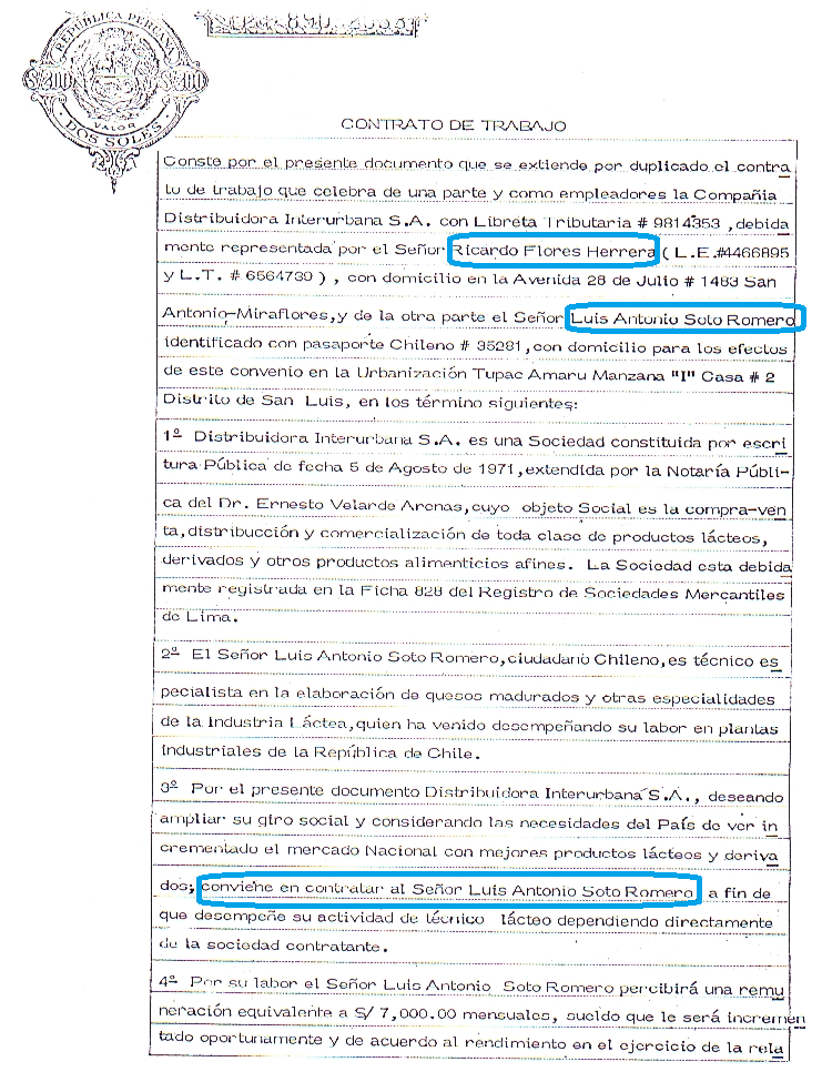Contrato de Trabajo tramitado por el hermano Ricardo Flores Herrera, lo que permitió que el divino Maestro se quedara en el Perú