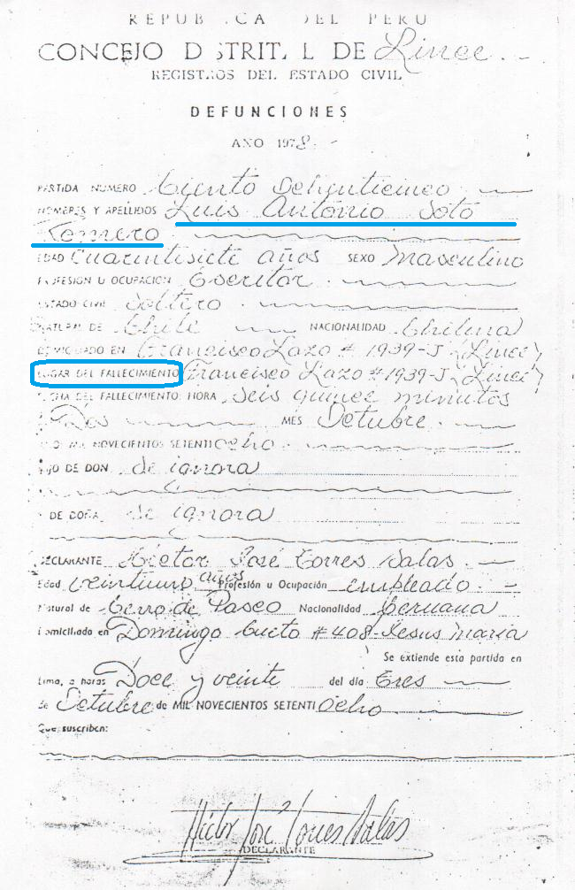 Fotocopia de la Partida de Defunción tramitada por el hermano Ricardo Flores Herrera. Nótese que el divino Maestro falleció en la casa del hermano Antonio Córdova Quezada, Francisco Lazo 1939-J, Lince