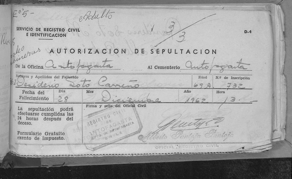 Autorización de sepultura de Desiderio Soto Carreño el 18 de diciembre de 1962