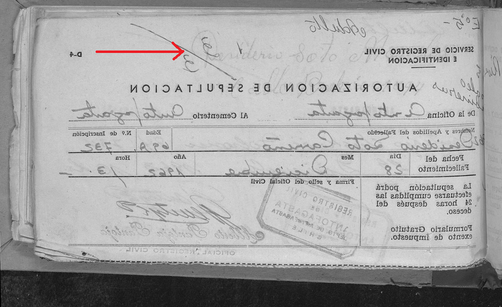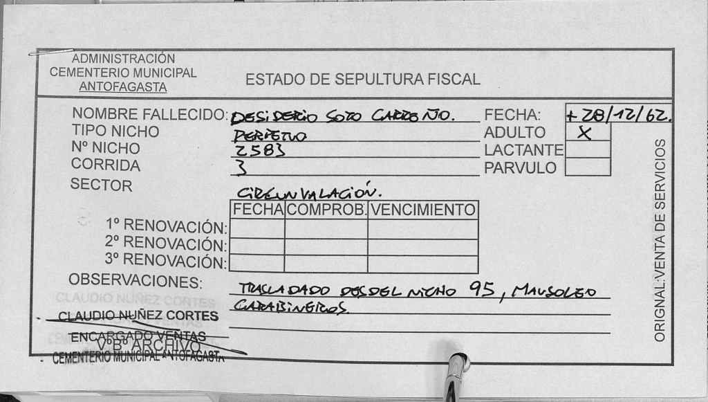 Nótese que al reverso de la autorización de sepultura está escrito el nombre de la persona que dio su autorización: Desiderio Soto Morales, posible hijo de Desiderio Soto Carreño, el padre de Alfa y Omega. Dirección: Calle Bahía 1094, Villa Esmeralda, Antofagasta, Chile