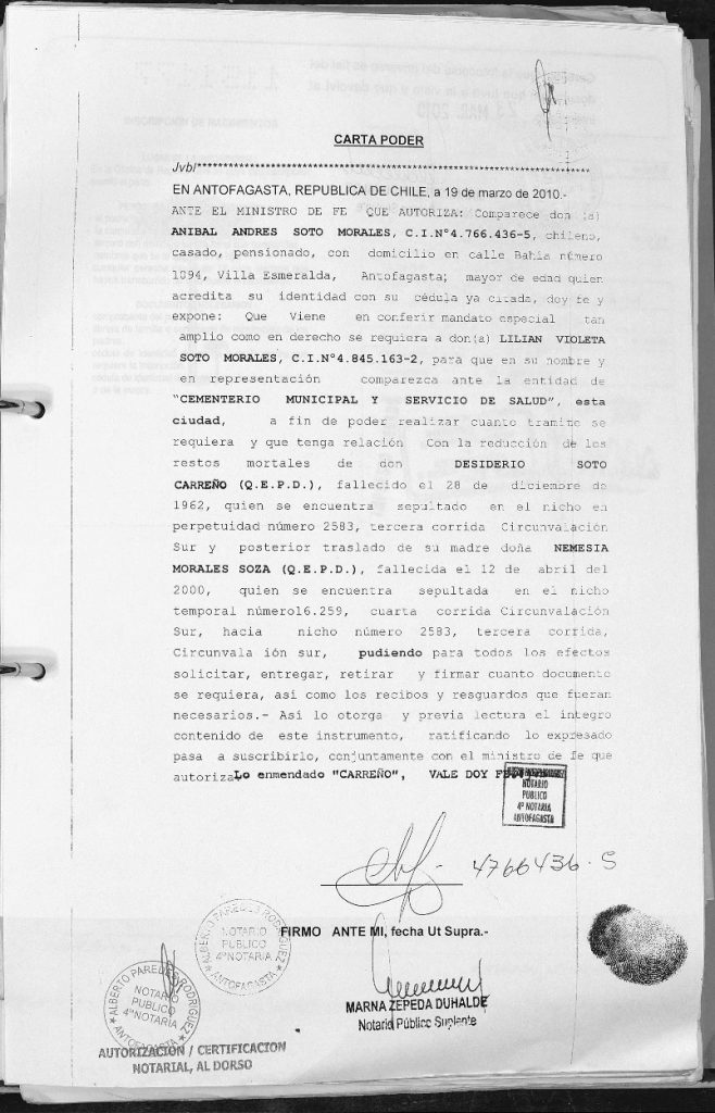 Carta poder a Andrés Aníbal Soto Morales para: Reducción de los restos mortales (exhumación para reducir volumen, tipo urna) para los restos de Desiderio Soto Carreño y el posterior traslado de los restos de Nemesia Morales Soza