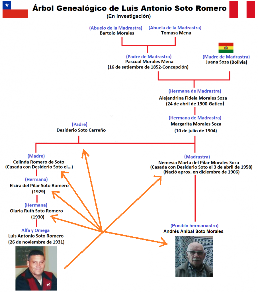Acá viene lo interesante. Aníbal Soto Morales es hijo de Nemesia Morales Soza (1906 – †2000) y Desiderio Soto Carreño(…. †1962), además se pudo rastrear su descendencia por parte de madre. Por lo tanto, si se confirma que el Desiderio Soto Carreño que figura en los documentos investigados, es el padre de Luis Antonio Soto Romero, los hijos de Desiderio y Nemesia, en este caso Andrés Aníbal Soto Morales, sería hermanastros del divino Maestro, tal como se muestra en el árbol genealógico.