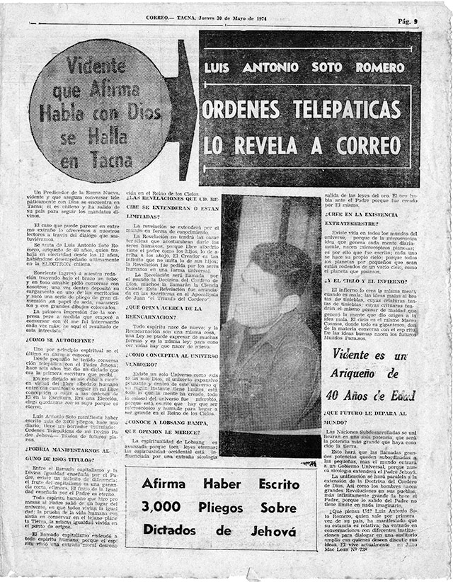 Un predicador de la Buena Nueva, vidente, y que asegura conversar telepáticamente con Dios, se encuentra en Tacna. Él es chileno y ha salido de su país para seguir los mandatos divinos. El caso puede parecer en extremo extraño, lo ofrecemos a nuestros lectores a través del diálogo que sostuviéramos. Se trata de Luis Antonio Soto Romero, ariqueño de 40 años, quien trabaja en electricidad desde los doce años, habiéndose desempeñado últimamente en la Electrón Chilena. Sonriente ingresó a nuestra redacción trayendo bajo el brazo un tubo; y en tono amable pidió conversar con nosotros; una vez dentro depositó su cargamento en uno de los escritorios y sacó una serie de pliegos de gran dimensión, en papel de seda, manuscritos y con grandes dibujos coloreados. La primera impresión fue la sorpresa, pero a medida que empecé a conversar con Él, me fui interesando cada vez más; he aquí el resultado de esta entrevista.