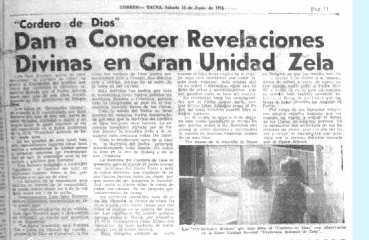 Luis Soto Romero, quien se hace denominar EL CORDERO DE DIOS, ha puesto a disposición del público sus rollos, que contienen la Escritura Telepática dictada por el Padre Jehová, desde hace más de seis años, constituyendo un rico patrimonio de religiosidad. Los Rollos de REVELACIÓN DIVINA, de acuerdo a lo manifestado por Soto Romero, son más de tres mil. Parte de estos dictados, copiados a mano y en largas hojas de papel manteca, se vienen exponiendo en el Salón Auditorio de la GUE Francisco Antonio de Zela, desde ayer. En las paredes de este local han sido especialmente pegados estos testimonios, y estudiantes de ambos sexos, y personas mayores, los contemplan con un halo de indecisión, ante la escritura y gráficos que contiene. Soto Romero manifestó a CORREO: Agradezco al Director del NEC 02, Guillermo Gamero Nieto, al dar preferencia a lo que es de Dios. La duración de la exposición será relativa al interés de la comunidad. Se puede visitar desde las 8 de la mañana hasta las 7 de la noche. Posteriormente, Luis Soto Romero dictará numerosas conferencias en este mismo local. Como una explicación de su misión, Luis Soto Romero puso a disposición de CORREO, un escrito que ponemos a su disposición: