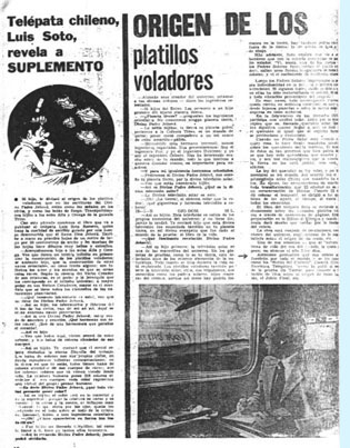 Redacción: El libro del telépata Soto, se extiende minuciosamente sobre los llamados platillos voladores a través de centenares de páginas. Está en preparación en la Editorial Kosmos, y cuando aparezca dará mucho que hablar por lo fascinante del relato. La obra está cuajada de revelaciones, descripciones del universo, explicaciones de los más detallada del origen de las cosas, etc.