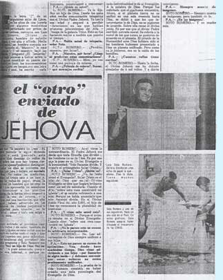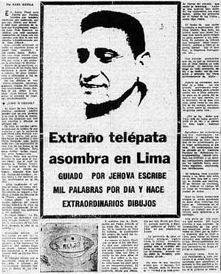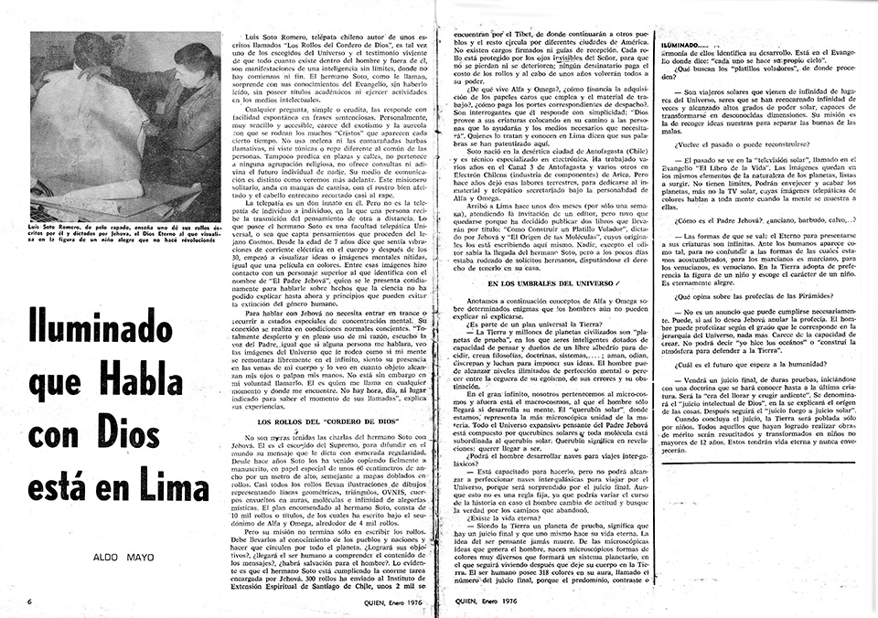 El juicio final será nación por nación, hombre por hombre, molécula por molécula, ojo por ojo, diente por diente, y está más próximo de lo que nos imaginamos, asegura Luis Soto Romero, un chileno que está causando conmoción en Lima con sus escritos, que dice le son inspirados telepáticamente por el Dios Jehová. Este extraño personaje escribe en enormes hojas de papel tipo manteca, a los cuales llama Rollos. En una hoja entran unas mil palabras manuscritas. No usa regla y sin embargo la escritura va derecho. Aparte de la escritura, en la mayoría de las hojas hace hermosos y raros dibujos a colores, de gran inspiración y diferentes a los de cualquier otro pintor. En los dibujos se ven discos voladores, planetas, galaxias, mapas del mundo con caprichosas líneas, diseños de las ideas, y muchas otras formas que el autor se encarga de explicar detalladamente.