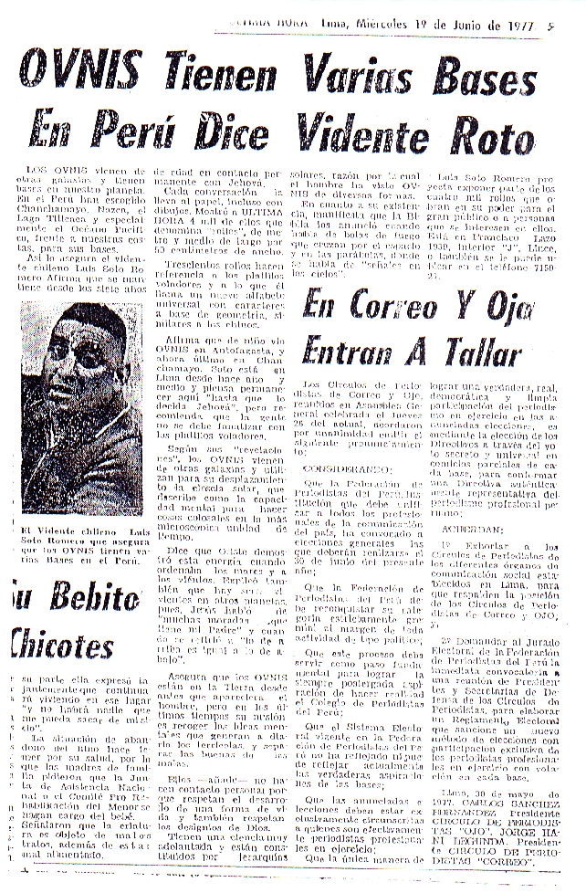 Afirma que de niño vio OVNIS en Antofagasta, y ahora último en Chanchamayo. Soto está en Lima desde hace año y medio, y piensa permanecer aquí hasta que lo decida Jehova, pero recomienda que la gente no se debe fanatizar con los platillos voladores.