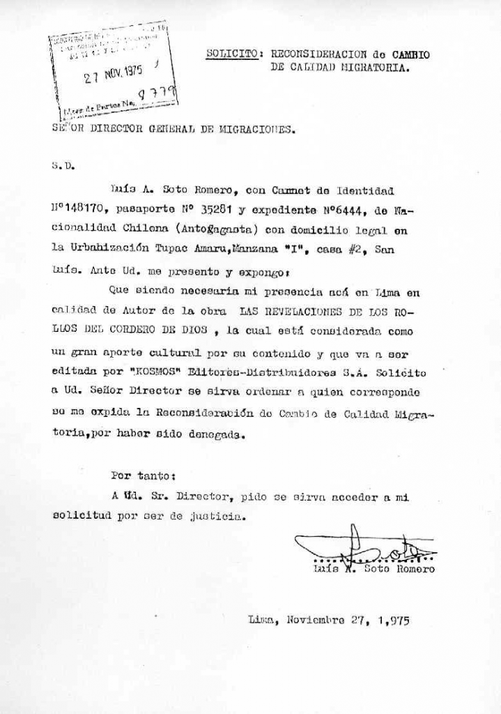 Antonio: Y yo en mi mente tenía ya —como le digo— la idea de que era el divino Maestro. Al siguiente día me levanté, creo que a las 6 de la mañana, me boté de la cama, me lavé la cara y todo, y me fui al taller, terminé unas órdenes y le dije: Bueno, van a venir personas con su recibo, me lo entregas y [ininteligible], saldo, etc. Y yo salí disparado rumbo a Surquillo. Llegué, ubiqué la dirección, entré. Era un edificio —cuarto piso—, subí caminando, ubico el departamento y toco la puerta, sale la hermana Rosalía: ¿Quién es? Le digo: Quisiera conversar con el hermano Luis unos minutitos para saludarlo y hacerle un par de preguntas y me retiro. Abre la puerta, me mira: A ver, espere un rato, voy a consultarle. Cierra la puerta y entra. Yo en mi mente: Que sí me atienda, aunque sea un ratito, quisiera saludarle, etc. Demoraría pues tres minutos, cuatro, y sale: Dice que pase. ¡Uf!, qué alegría. Mentalmente: Padre Divino, gracias. Sígame —me dijo—. La seguí así, por un… Primero era un comedor, después unos dormitorios y al fondo había un cuartito, casi la mitad de esto, así. Y ahí estaba el divino Maestro, estaba escribiendo. Yo tenía miedo interrumpirle, como lo veía que estaba que escribe. Él escribe, rápido escribe, ¡uf!, de extremo a extremo el papel. [Nota: Esta versión, que el divino Maestro escribía muy rápido y en pocos minutos, es contraria a todos los testigos que los vieron escribir, tanto en Chile como en Perú, donde narran que escribía como cualquier ser humano normal y le demoraba toda la noche] Hermanito, buenos días. ¡Buenos días! —me dice—. Y ahí me quedo yo, callado porque tenía miedo de interrumpirlo, y Él me dice: Converse hermano, ¿qué le pareció la charla de anoche? O sea, me daba esa confianza de conversarle y yo comienzo a conversar. Y para mí fue una sorpresa, Él me seguía conversando y seguía escribiendo simultáneamente. Yo decía: Pero yo no puedo hacerlo, escribir y conversar, un poco difícil… Para la divinidad no hay imposible. Entonces, yo seguí conversando, tomé confianza y una conversación. Y el seguía escribe, y escribe, y escribe. De repente llega al final del papel, pone un puntito ahí, y guion, y lo levanta el plano: Hermano, aquí tenemos uno más para la colección.